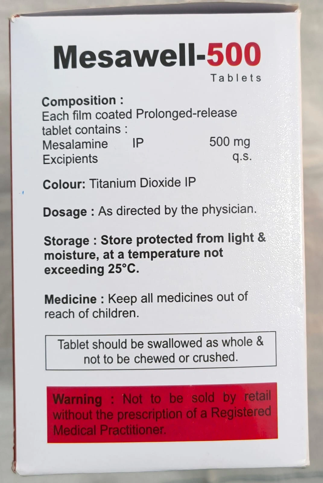 Mesawell-500 contains Mesalamine Prolonged-Release 500mg, a clinically proven anti-inflammatory medication for the treatment and maintenance of ulcerative colitis and Crohn’s disease. This oral prolonged-release tablet reduces inflammation in the intestinal lining, helping relieve abdominal pain, diarrhea, rectal bleeding, and bowel discomfort.