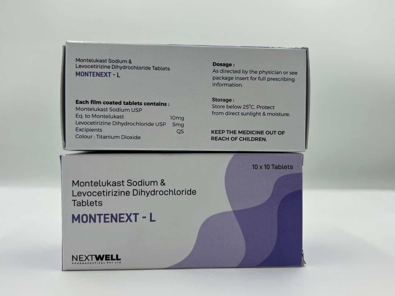 MONTENEXT-L Tablets are a clinically proven combination of Montelukast Sodium and Levocetirizine Dihydrochloride, designed to provide effective relief from allergic rhinitis, seasonal allergies, and asthma-related symptoms. This dual-action formulation helps reduce inflammation, control allergic responses, and improve respiratory comfort, ensuring better quality of life.