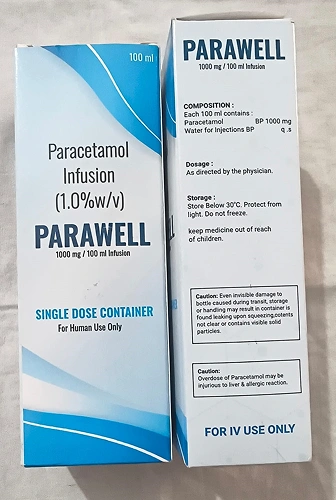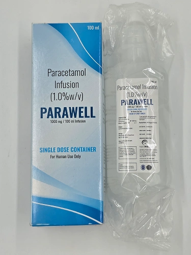 Parawell Infusion contains Paracetamol 1.0% w/v, a fast-acting antipyretic and analgesic used for the relief of fever and moderate pain. It is administered by intravenous (IV) infusion under the supervision of a healthcare professional. This formulation is especially effective in patients who cannot take oral medication.